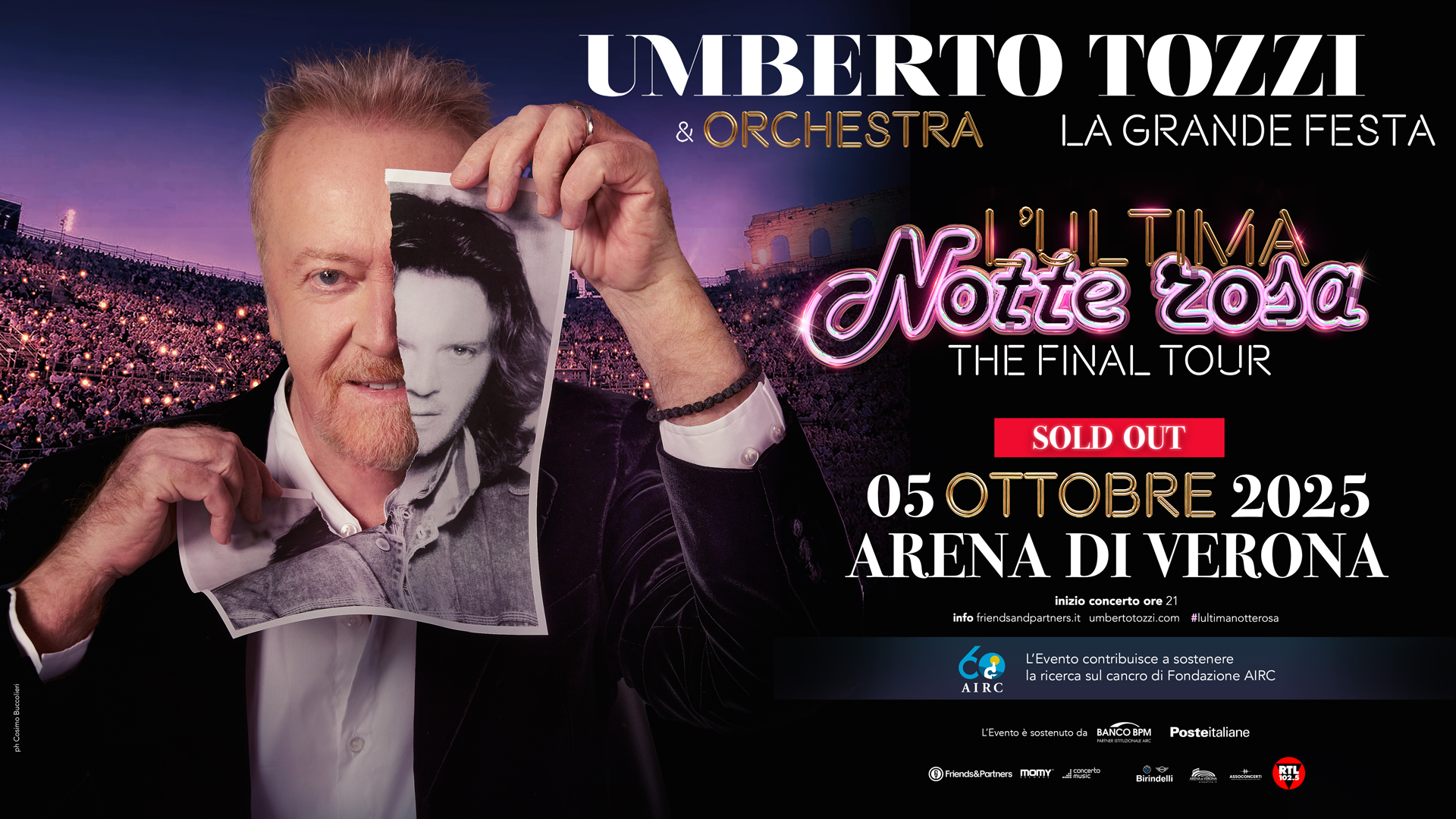 Lo speciale appuntamento all’Arena di Verona con “L’ULTIMA NOTTE ROSA THE FINAL TOUR” di Umberto Tozzi ha un ulteriore valore aggiunto perché si inserisce tra gli eventi del Sessantesimo anniversario di Fondazione AIRC per la ricerca sul cancro che celebra sei decenni di impegno per rendere il cancro sempre più curabile. Un impegno concreto che si è tradotto in circa 2,5 miliardi di euro destinati al sostegno della migliore ricerca oncologica indipendente nel nostro Paese.